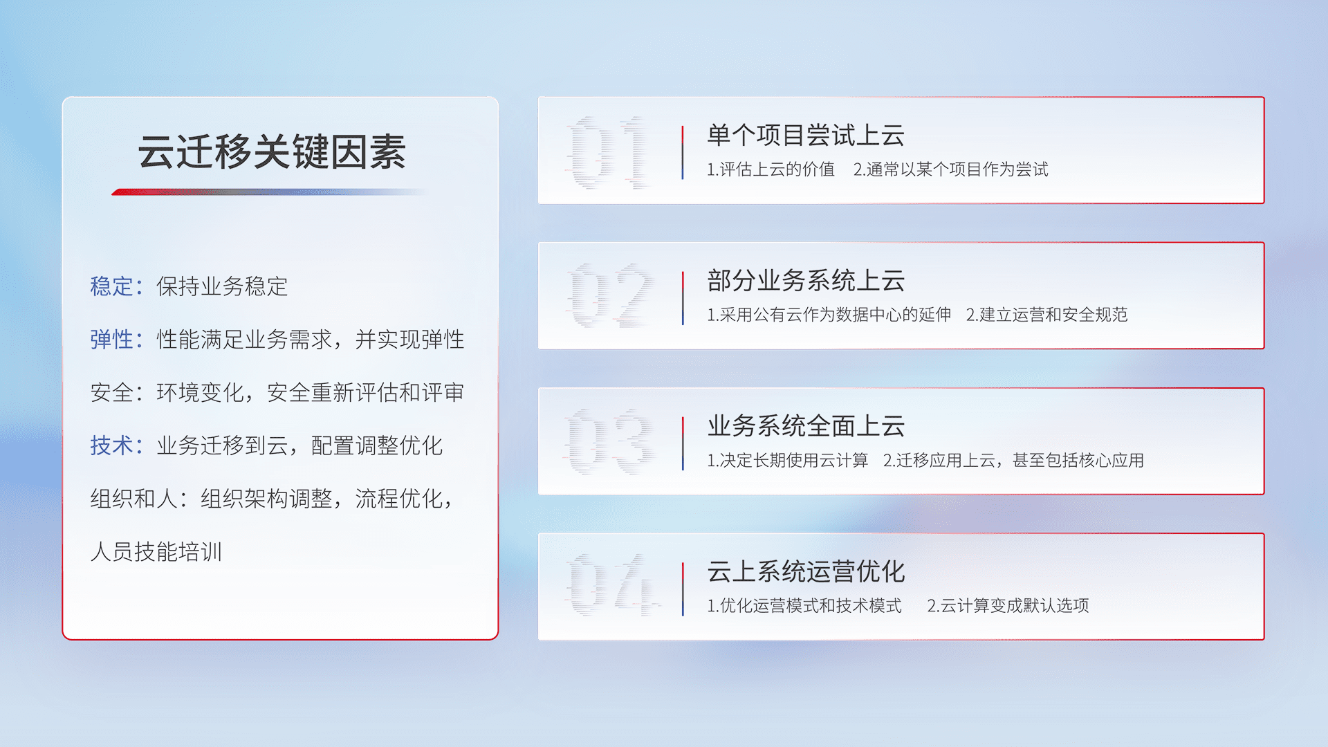 结合实际业务,,从规划设计、、、云平台选型、、、、云原生改造、、、数据迁移、、、集成交付,,,迁移全过程为客户识别最佳上云路径,,做好风险识别管理,,,设计网络架构、、、身份权限、、、、安全审计合规、、、操作审计、、、日志审计、、监控告警策略、、、、多站点容灾设计等,,,对云上基础设施进行整体规划,,提升IT治理水平,,,以满足弹性、、高可用、、高性能的需求。。。。
